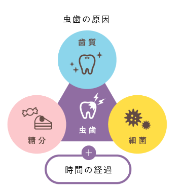 むし歯は、3つの要素(歯質、細菌、糖分)が原因で放置しても自然に治ることはなく、時間の経過とともに進行していきます。