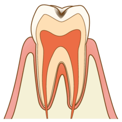 | 歯の表面のエナメル質が、わずかに溶けている状態。 まだ痛みもなく、定期健診で見つけることができた場合、早期に対応できます。 適切な歯磨きやフッ素塗布などで歯の再石灰化を促せば、治癒できるケースもあります。 |