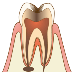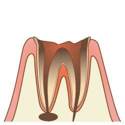 歯冠部分がほとんど溶けてなくなり、むし歯が歯根まで到達した状態。 神経が死んで一旦痛みがなくなりますが、歯根の先に膿が溜まることで、再び激しい痛みが生じます。 抜歯を行い、抜歯後はインプラントやブリッジ、入れ歯で噛む機能を回復させます。 |